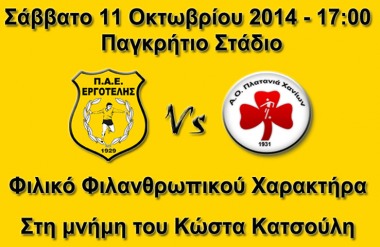 Το Σάββατο 11/10/2014 στις 17:00 στο Παγκρήτιο Στάδιο, η ομάδα μας θα αντιμετωπίσει τον Πλατανιά σε φιλικό αγώνα αφιερωμένο στη μνήμη του αδικοχαμένου φιλάθλου, Κώστα Κατσούλη.